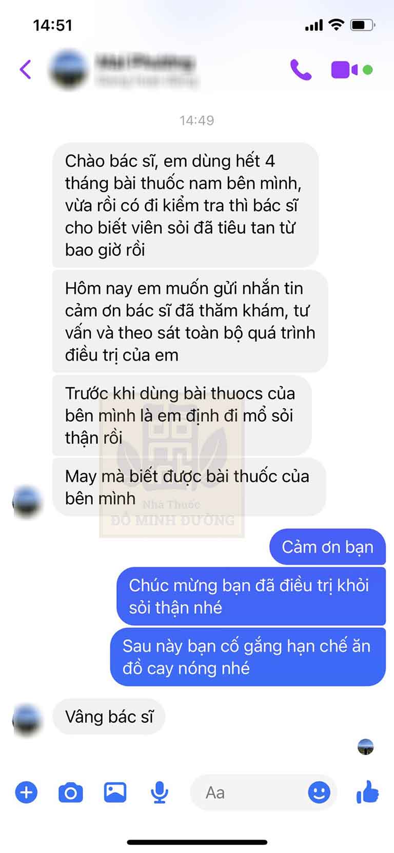 Tình cờ tôi được một người bà con xa đang sống ở Hà Nội giới thiệu đến bác sĩ Nguyễn Thị Vân Anh chữa bệnh sỏi thận rất mát tay. Lúc đầu tôi cũng rất ái ngại vì quá mất niềm tin vào những thầy thuốc trước đây, nhưng cuối cùng khi tìm hiểu kỹ thì thấy bác sĩ Vân Anh được nhiều người phản hồi, nhận xét chữa bệnh sỏi thận rất hiệu quả nên tôi lại quyết tâm đến Đỗ Minh Đường. Quả thật đúng như lời đồn, sau khi được bác sĩ khám tận tình, kê đơn thuốc uống 3 tháng là tôi siêu âm hết hẳn sỏi thận, đến tận bây giờ không tái phát lại.”